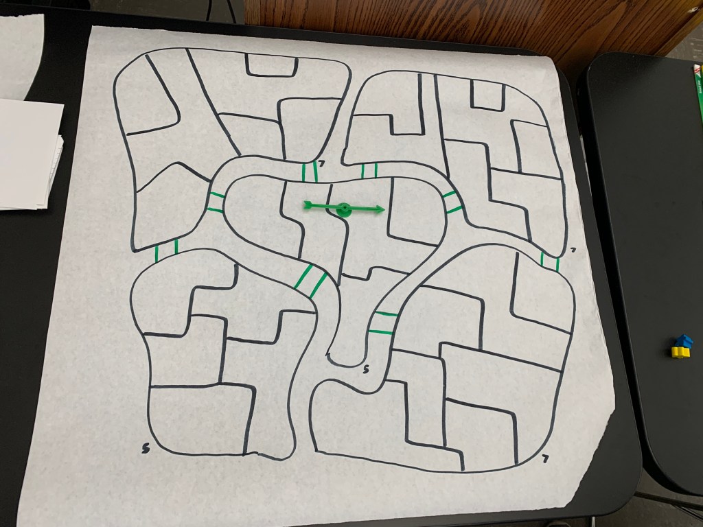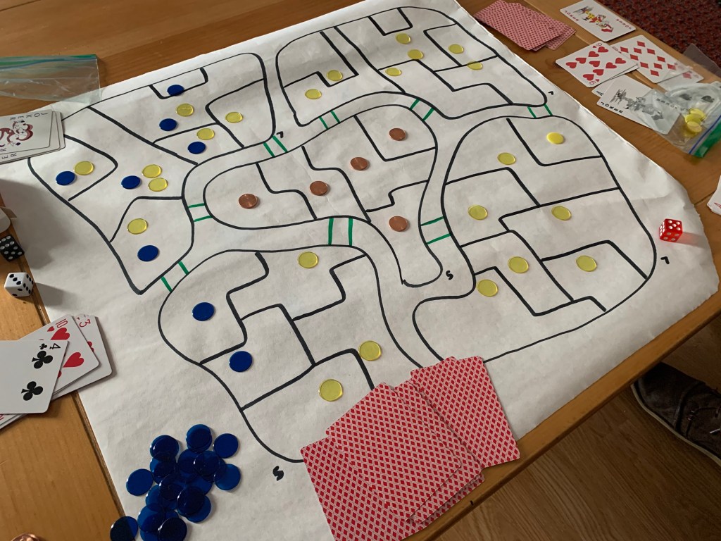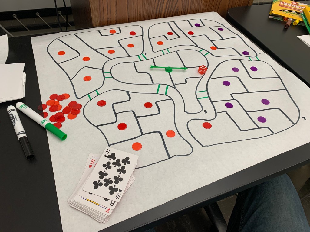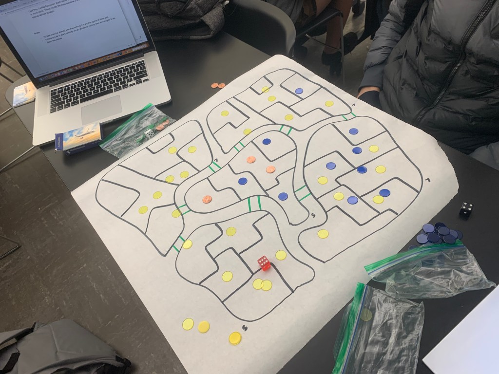 In play session one my partner Erik and I decided on a territorial strategy board game. So each player was given 25 colored circular chips and also half of a shuffled deck. We then flipped a card to see who goes first and the highest card wins. Erik won the first one and then rolled a 5 with a 6 sided die he was given. Therefore he was able to put 5 of his colored chips anywhere on the board besides the middle island. After that you play games of the classic card game “war” to determine who gets to roll to put down their colored chips. Winner also takes the losers cards. Erik kept winning but I eventually made a come back to where the board was half filled with my chips and half filled with his. At this point the middle island still wasn’t established as anything so instead we played to see who can fill up all the land surrounding it. The only difference when it came down taking over each others land was that the number of spots you were taking over that’s how many cards you put down and the last card is the one that counts. For example, I rolled a 4 and wanted to take four Eriks spots so we put down 3 face down cards on the table then the fourth one is shown which I had the higher card therefore I take his land and all of the cards. Surprisingly I ended up winning by taking over all the surrounding land but still was trying to figure out how to incorporate the middle Island.